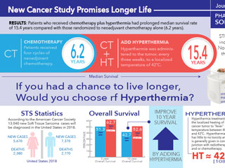 Long term data of the EORTC 62961-ESHO 95 trial comparing neoadjuvant chemotherapy vs. neoadjuvant regional hyperthermia plus chemotherapy for patients with localized high-risk soft tissue sarcoma was published by Issels et al. in February 2018 based on a median follow-up of 11.3 years. The recruitment of the total number of 341 patients was conducted from July 1997 to November 2006. The database for this analysis was closed in December 2014. The extended follow-up duration is necessary to analyze potential differences in the secondary trial endpoint of overall survival. The significance of the results is that the addition of regional hyperthermia did not only improve local progression-free survival but also significantly improved overall survival as compared to neoadjuvant chemotherapy alone.